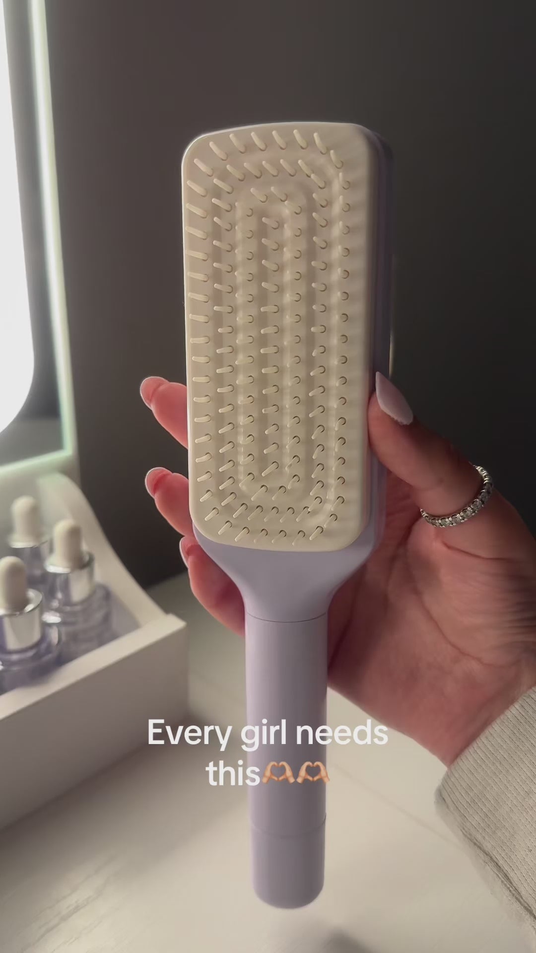 Meet the Self-Cleaning Hairbrush, your new everyday essential. Just turn the handle to the right to retract the bristles and instantly release trapped hair. Designed for all hair types, it gently massages your scalp, reduces frizz, and keeps your style sleek and smooth. No mess, no stress. Just beautiful hair, effortlessly.